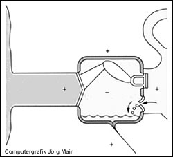 Bei einer starken Auslenkung des Trommelfells in Richtung Mittelohr kommt es über die Gehörknöchelchenkette zu einem tiefen Einpressen der Steigbügelfußplatte in das ovale Fenster. Durch den steigenden Druck in der Innenohrflüssigkeit wird das runde Fenster in Richtung Mittelohr gewölbt.