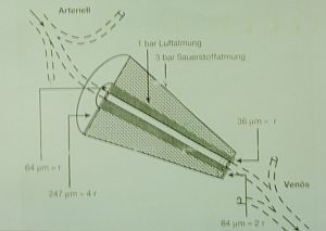 Durch die gesteigerte Sauerstofftransportkapazität, sowie die größere Konzentrationsdifferenz zwischen dem Blut und den Geweben wird die Diffusionsrate gesteigert und die Diffusionsstrecke innerhalb der Gewebe verlängert. Die Sauerstoff-Diffusionsstrecke im Gewebe (Krogh-Zylinder-Modell) erhöht sich hierdurch bis auf den 4-fachen Radius und erreicht ein Vielfaches des normalen Gewebevolumens. In der Folge können auch Bereiche mit sonst gestörter Sauerstoffversorgung, aufgrund von Mangeldurchblutung oder Steigerung des Diffusionswiderstandes (z.B. Ödembedingt), eine normale Sauerstoffversorgung der Zellen aufrechterhalten. Allerdings muß an dieser Stelle auf die Notwendigkeit einer vorhandenen, wenn auch eingeschränkten, Mikrozirkulation hingewiesen werden.