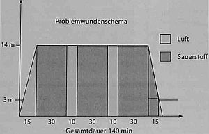 Dem wird im allgemeinen durch intermittierende Applikation des Sauerstoffs ("Luftpausen") und das Einhalten von bestimmten Druck- und Zeitprofilen für die Behandlung ("Tabellen") vorgebeugt. Dadurch läßt sich beispielsweise die Inzidenz für eine cerebrale Sauerstoff-Intoxikation (Krampfanfall) in einem Problemwundenschema (siehe Abbildung) auf unter 1:10.000 senken. Darüber hinaus besteht bei mangelnder Sorgfalt und technischen Störungen eine erhöhte Brandgefahr in der Kammer.