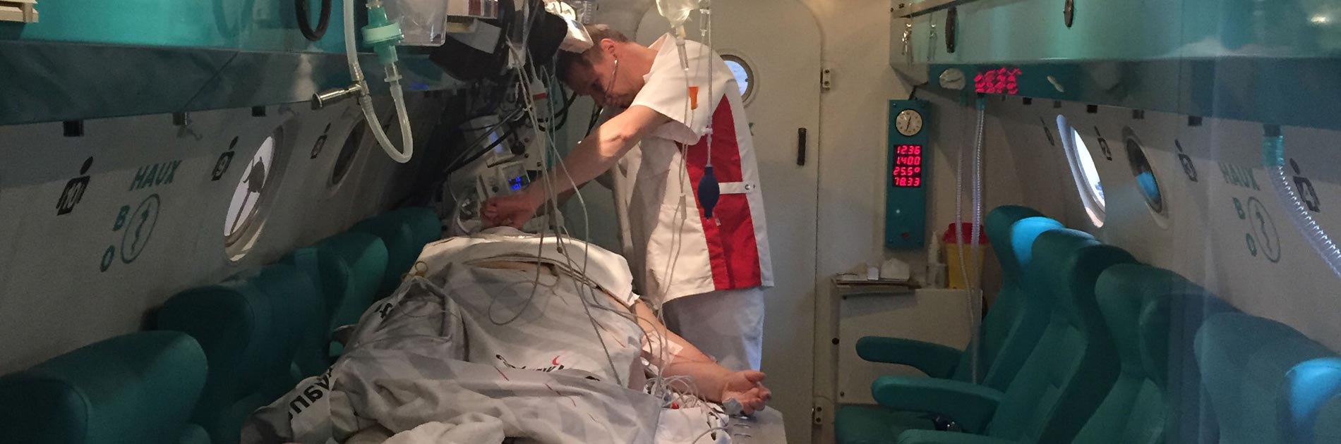 Hierdurch ist, im Gegensatz zu anderen Ländern, keine dauernde Anwesenheit von Personal in der Kammer während der Behandlung erforderlich. Die Belastung, und das Gefährdungspotential durch die wiederholten Expositionen, für das Druckkammerpersonal wird dadurch erheblich gesenkt. Allerdings sollte dann jeder Patient während der Behandlung mittels EKG, nicht-invasivem Blutdruck und transcutaner oder exspiratorischer Messung des Sauerstoffpartialdrucks zusätzlich überwacht werden. Eine ständige verbale Kommunikationsmöglichkeit mit den Kammerinsassen ist selbstverständlich. Im Notfall können über Schleusen jederzeit Personen oder Gegenstände in die Kammer hinein- oder herausgebracht werden.